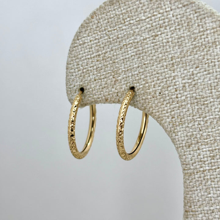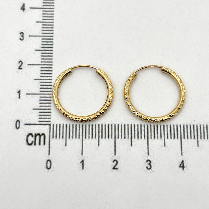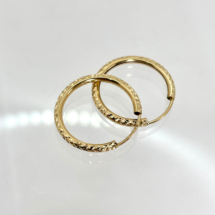 Estas arracadas facetadas de oro italiano 14k, con un diámetro de 2 cm, ofrecen un equilibrio perfecto entre elegancia y sofisticación. Su diseño detallado potencia la luz y el brillo del oro, asegurando un acabado impecable que realza cualquier estilo. Gracias a su alta calidad y acabado experto, son ideales para quienes buscan una pieza duradera y versátil para uso diario o ocasiones especiales.