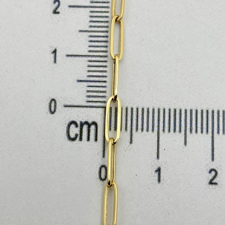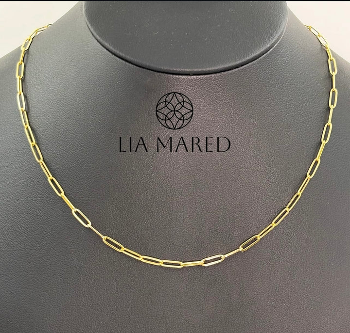 Esta cadena clip de 45 cm está elaborada en oro italiano de 14k, garantizando durabilidad y un brillo excepcional. Con un grosor de 3 mm, ofrece un equilibrio perfecto entre delicadeza y presencia, ideal para complementar cualquier estilo con elegancia y sofisticación. Un accesorio atemporal que realza tu look diario con un toque de distinción.