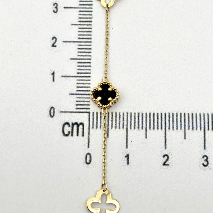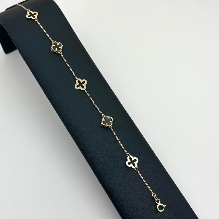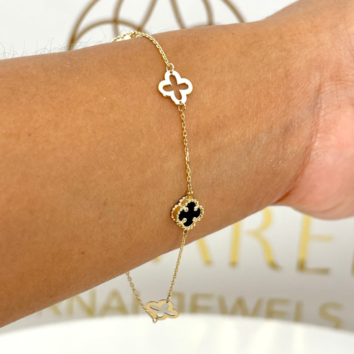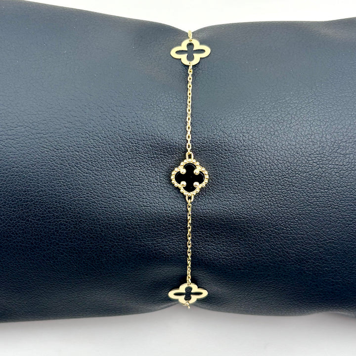 Pulsera calada de oro 14k con tréboles de ónix mod. 2470