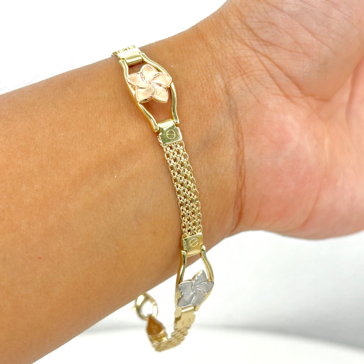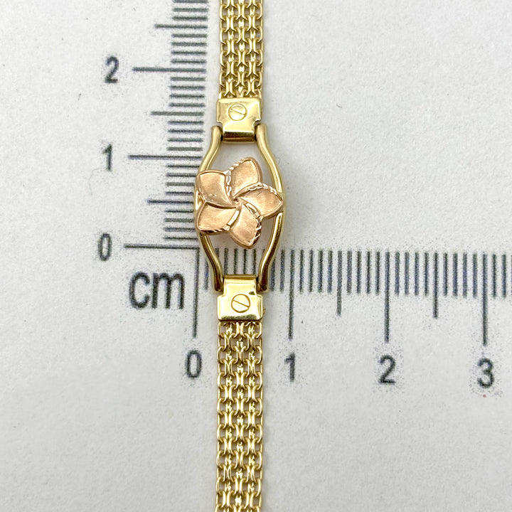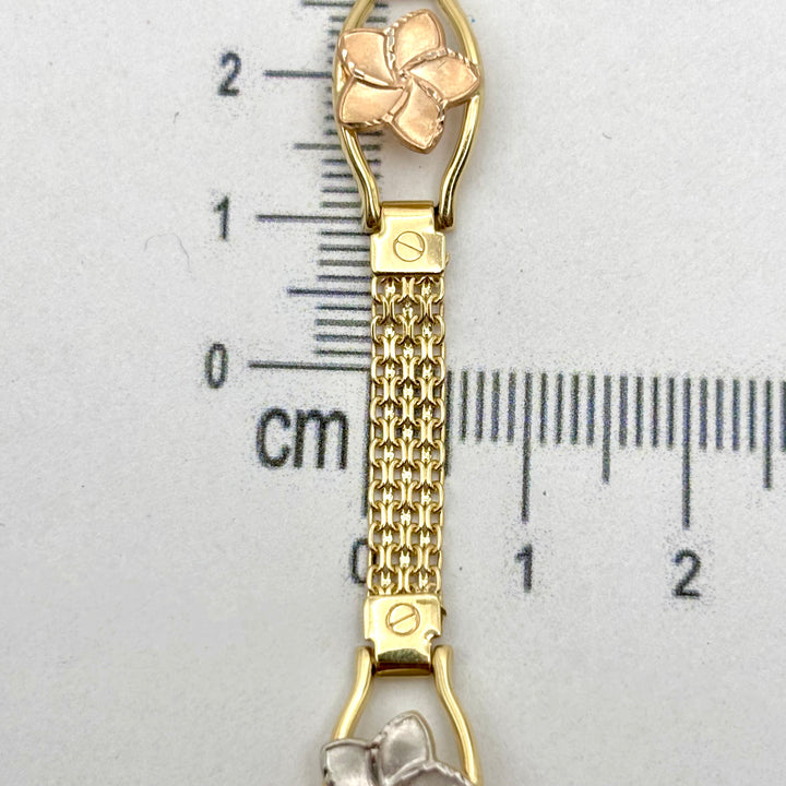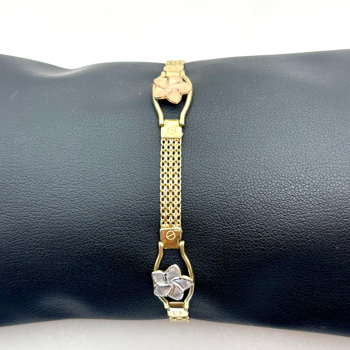 Esta elegante pulsera de flores, realizada en oro florentino de 14k, mide 18 cm de largo y 5 mm de ancho, con delicadas flores de 9 mm que realzan su diseño. Su tamaño y detalles cuidadosamente elaborados la convierten en el accesorio perfecto para añadir un toque sofisticado y femenino a cualquier atuendo. Ideal para quienes buscan una joya fina y versátil que refleje elegancia y estilo.