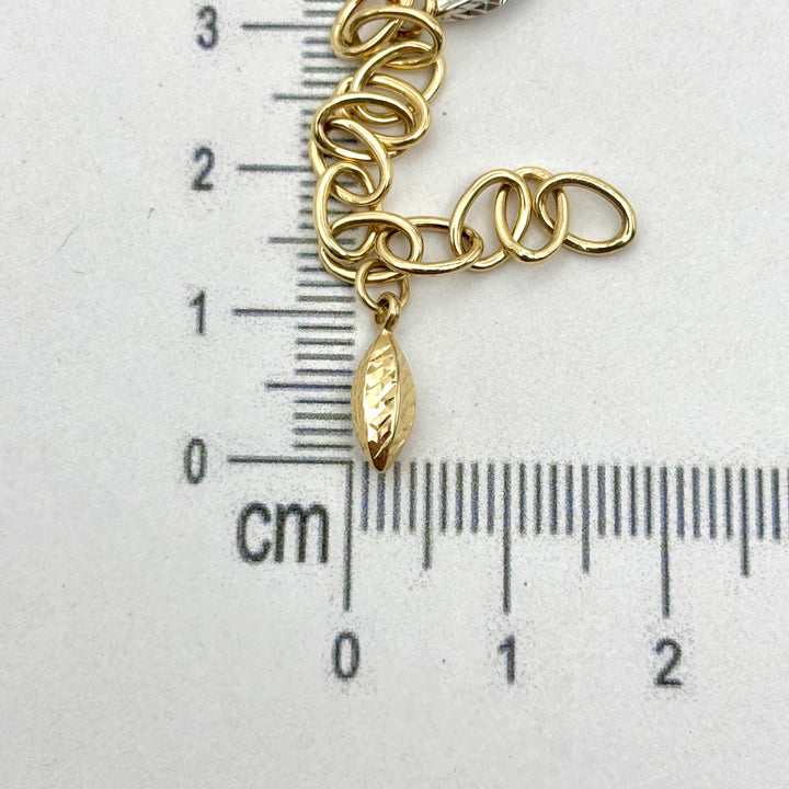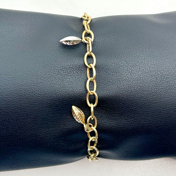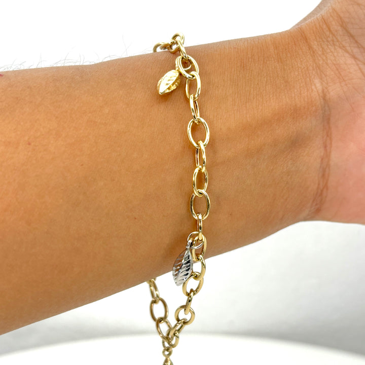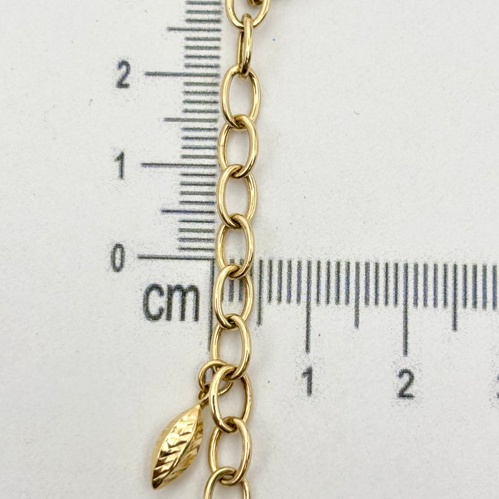 Esta pulsera de hojas en oro italiano 14k combina elegancia y durabilidad, con una longitud de 18 cm que se adapta cómodamente a la muñeca. Su acabado fino y diseño detallado realzan cualquier atuendo, ofreciendo un accesorio sofisticado y resistente para uso diario o eventos especiales.