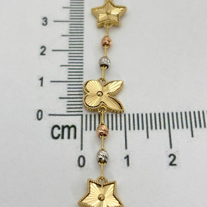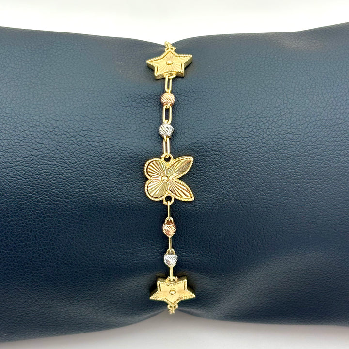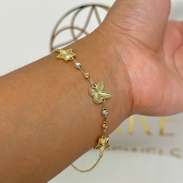 Inspirada en la delicadeza de la naturaleza y el brillo de las estrellas, esta pulsera combina figuras de mariposa y estrellas con finos acentos en oro amarillo, blanco y rosa.