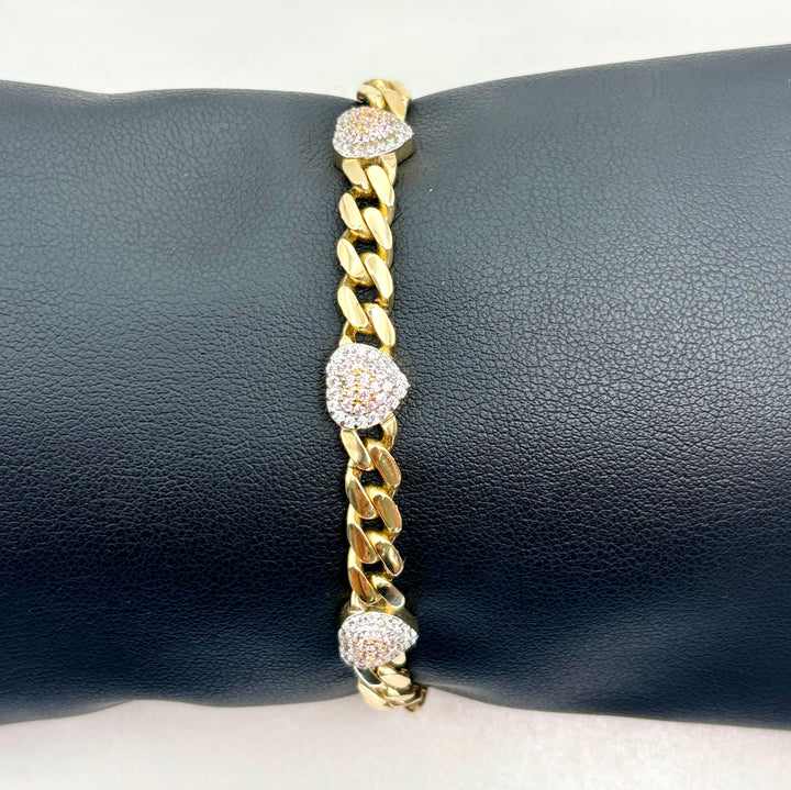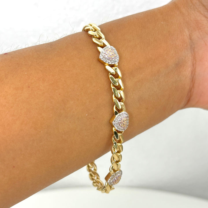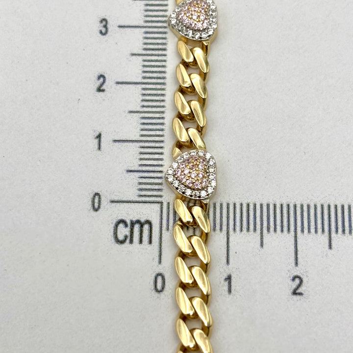 Esta pulsera de oro italiano de 14k, con una longitud de 18 cm y un ancho de 5 mm, destaca por sus delicadas incrustaciones de circonias rosas y blancas. Su diseño con corazones aporta un toque sofisticado y elegante, ideal para quienes buscan una pieza fina que combine brillo y delicadeza en cualquier ocasión.