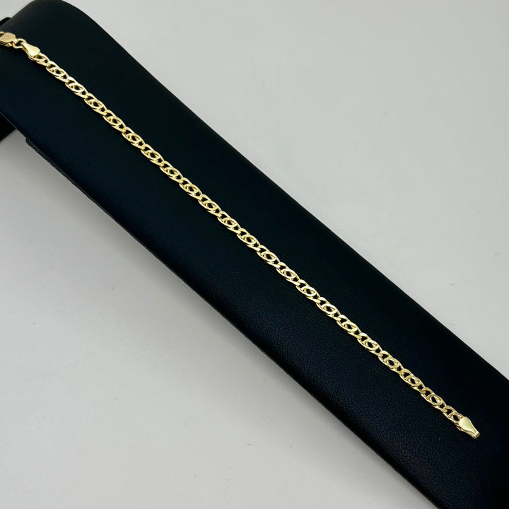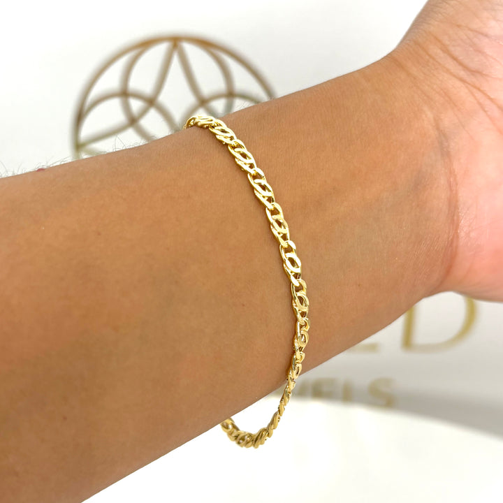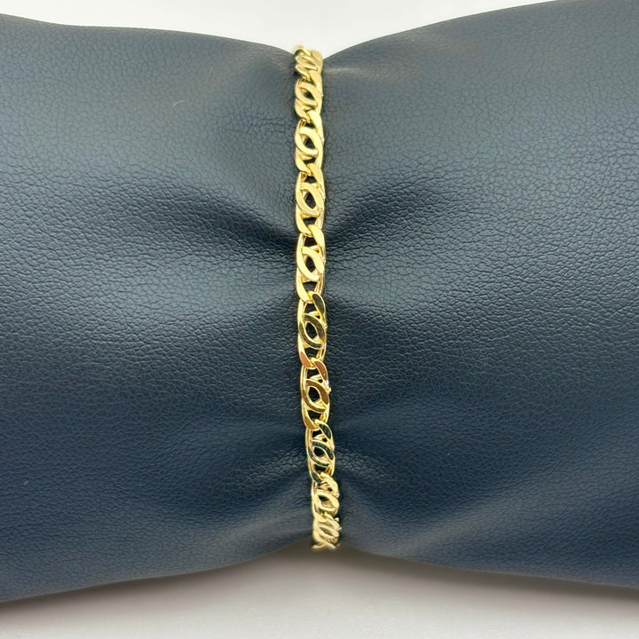 Esta pulsera de tejido ojo de tigre está elaborada en oro italiano de 14k, ofreciendo durabilidad y un brillo elegante. Con una longitud de 18 cm y un ancho de 3 mm, combina comodidad con un diseño sofisticado que realza cualquier estilo. Ideal para quienes buscan una pieza versátil y con un toque distintivo.