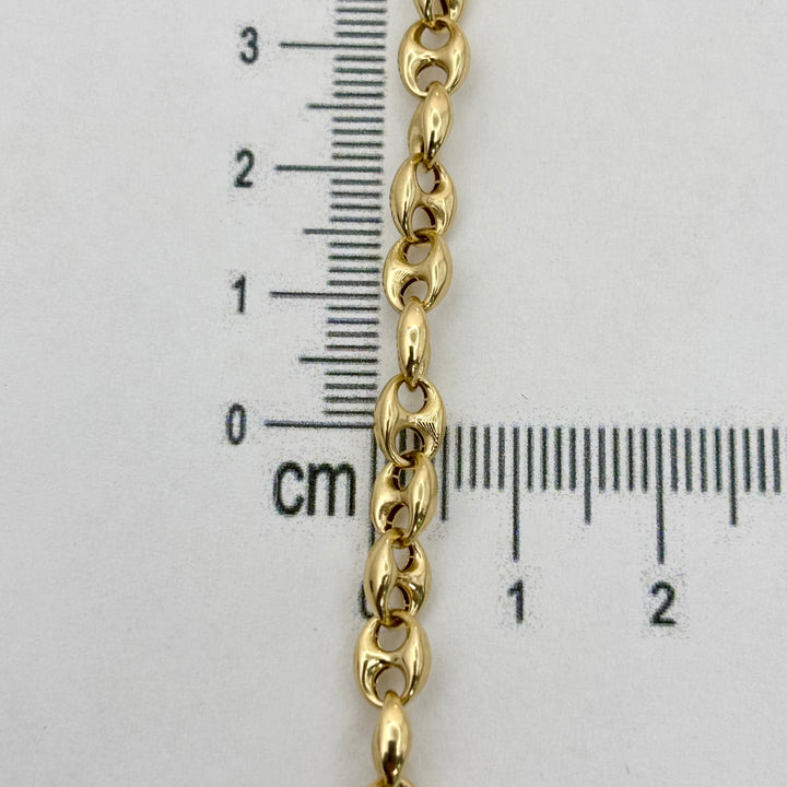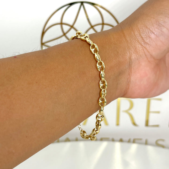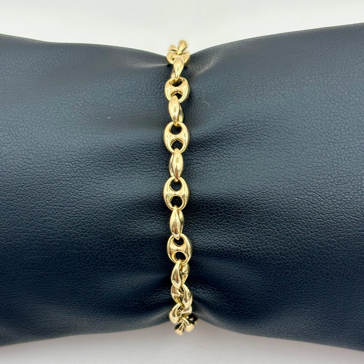 Pulsera tipo diseñador confeccionada en oro amarillo 14K de alta pureza. Presenta un largo de 18 cm, ideal para muñecas estándar, con un ancho de 5 mm que proporciona presencia sin resultar excesiva. El oro italiano garantiza calidad y durabilidad excepcionales. Diseño versátil que combina elegancia clásica con un toque contemporáneo, perfecto para uso diario o en ocasiones especiales. Pieza de joyería fina que representa una inversión en estilo duradero.