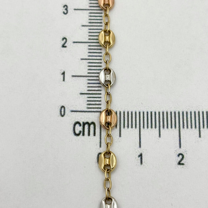 Un diseño distintivo que combina los tres tonos clásicos del oro: amarillo, blanco y rosa, creando una pieza llena de brillo y sofisticación.