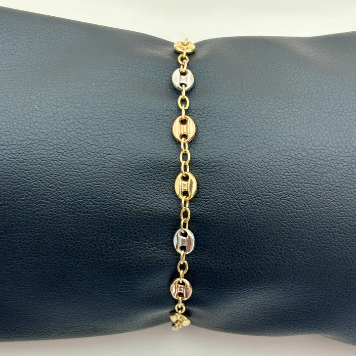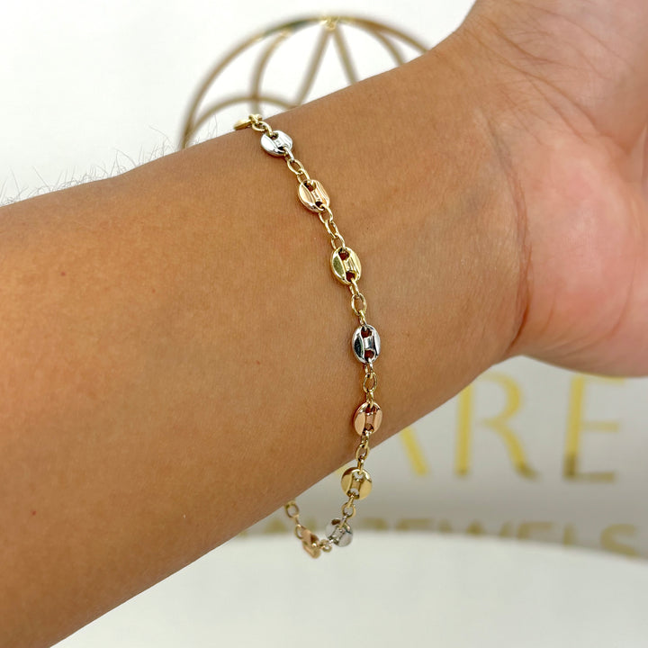 Cada eslabón redondeado refleja la luz con un acabado pulido que resalta la elegancia natural del oro italiano, perfecta para quienes buscan una pulsera fina, moderna y con significado.